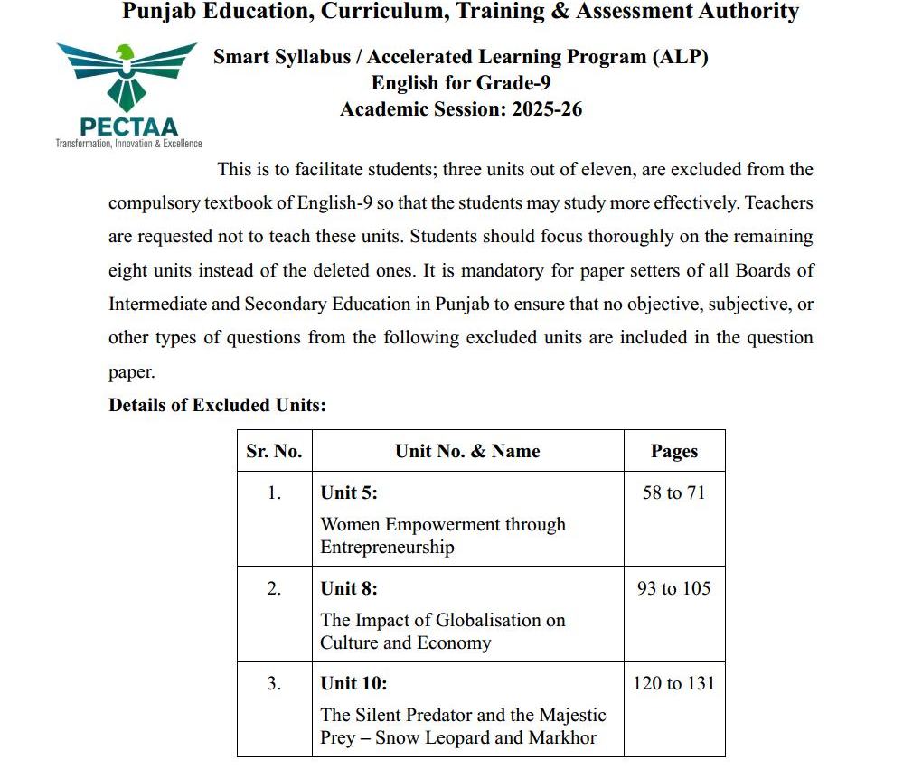 ❌ Removed Units from the 9th Class English Smart Syllabus (PECTAA ALP) 2025-27