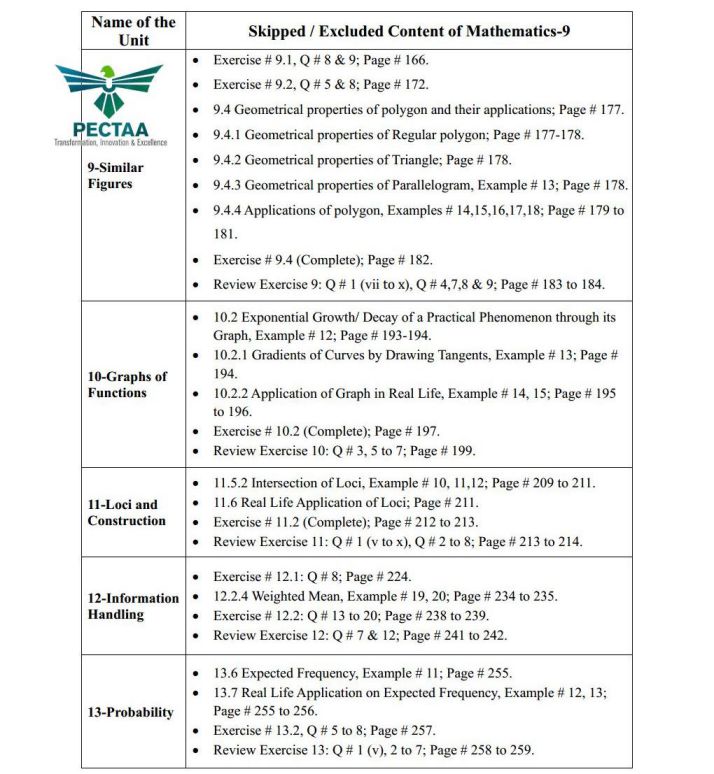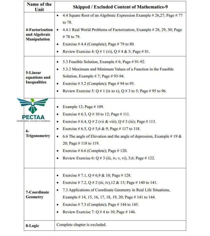 ❌ Removed Units from the 9th Class Math Smart Syllabus (PECTAA ALP) 2025-27