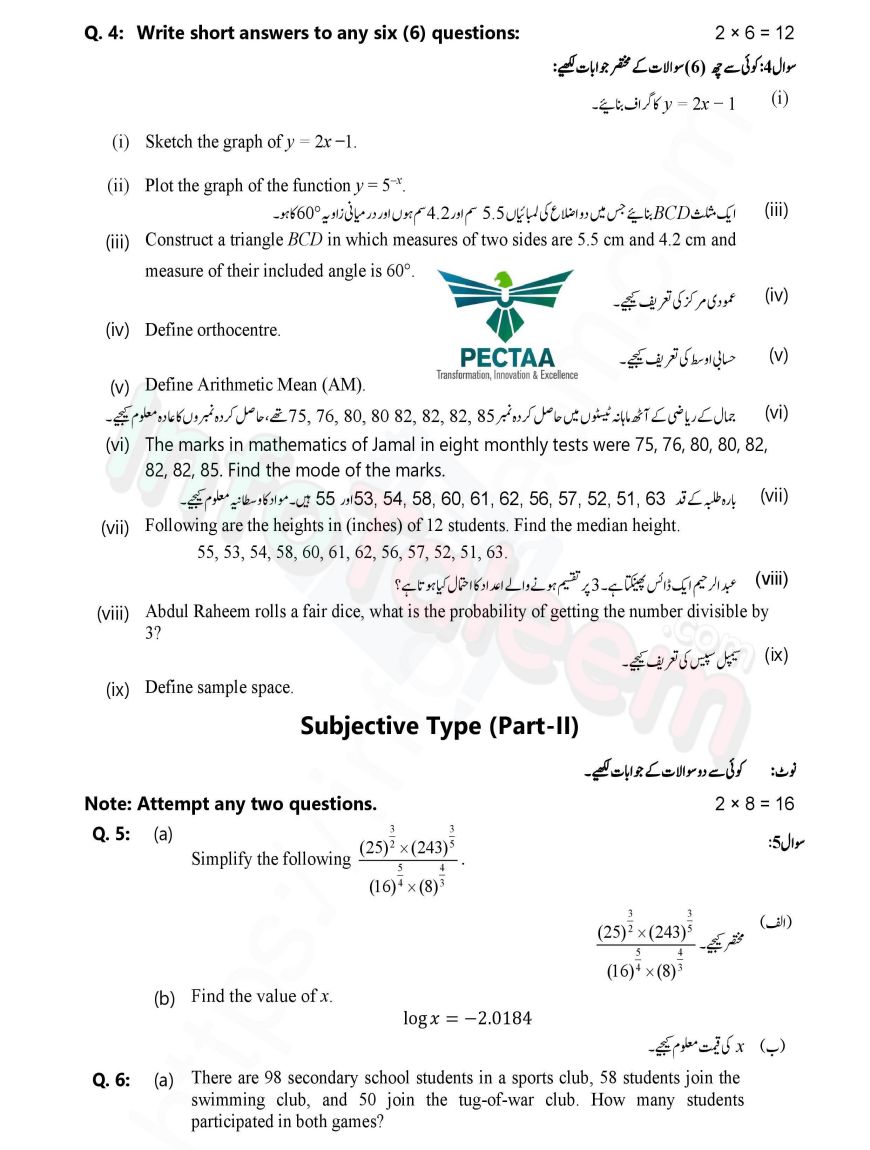 9th Class Math Pairing Schemes and Model Papers 2025-27