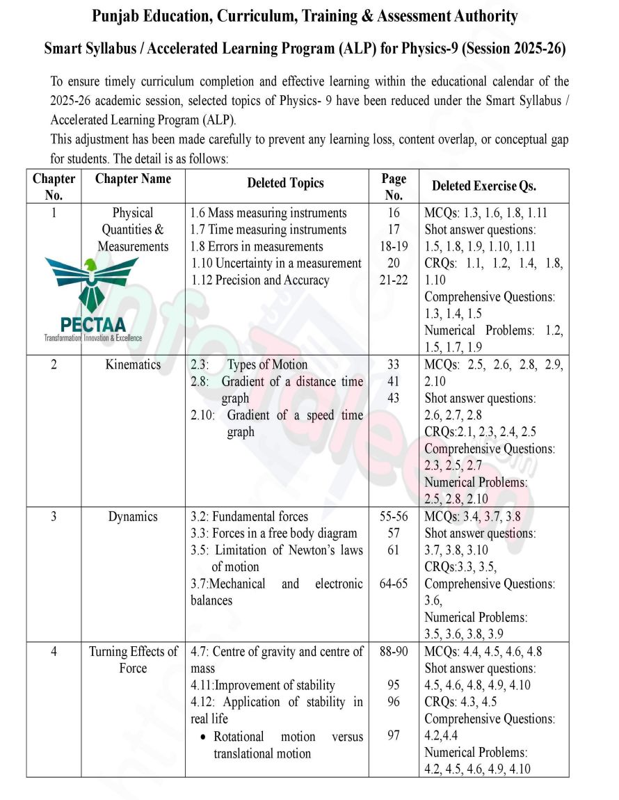 Physics often seems challenging, but with the Smart ALP Syllabus 2025–27, students can now prepare easily and efficiently. The Punjab Education, Curriculum, Training & Assessment Authority (PECTAA) has officially reduced selected topics under the Accelerated Learning Program (ALP) to make learning more focused and time-efficient.