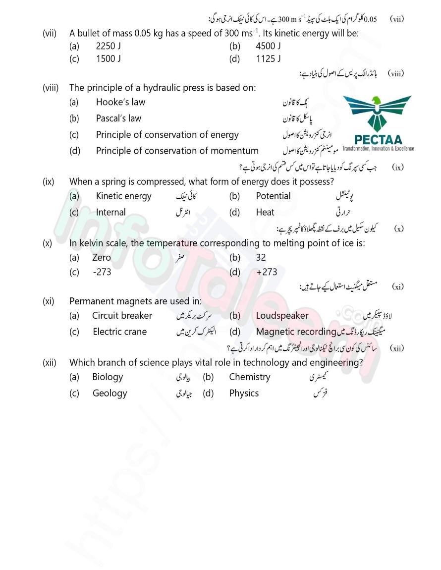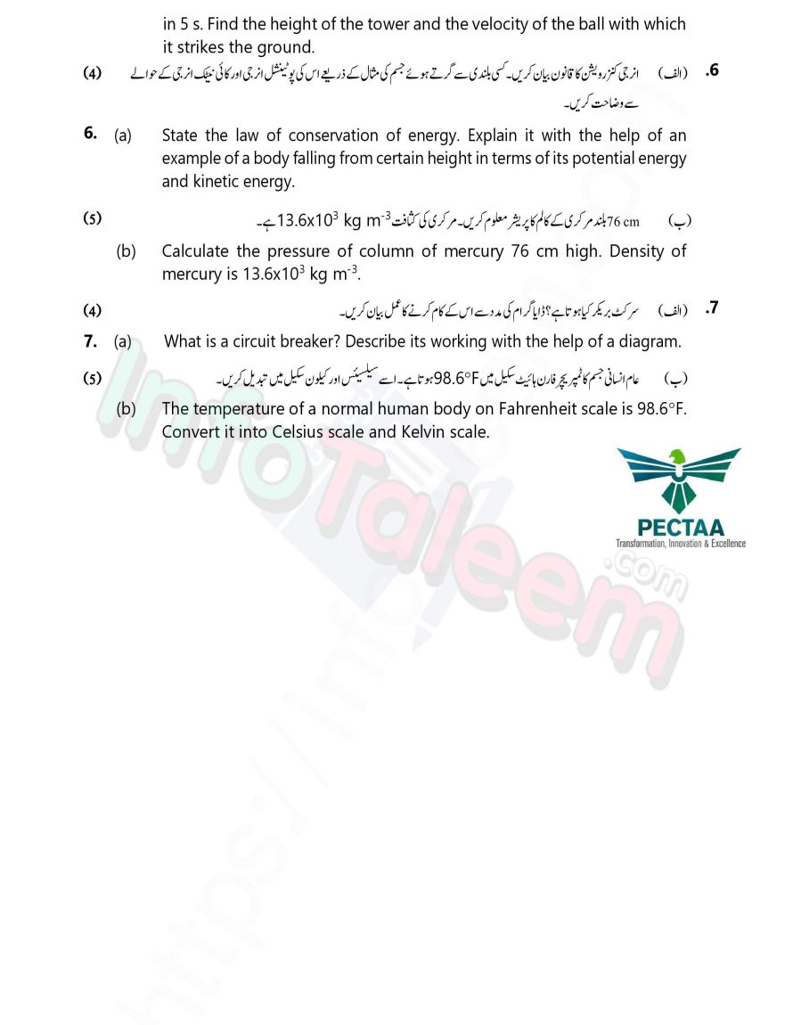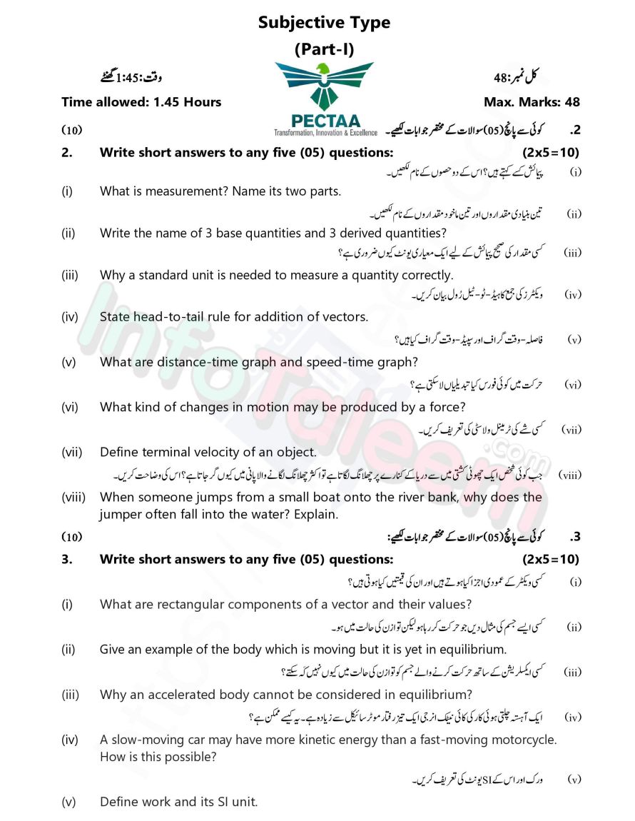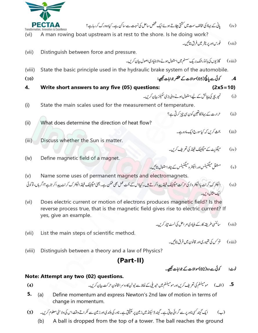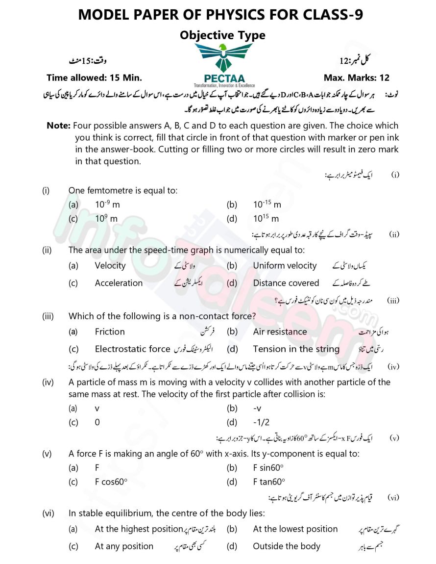 According to the official paper pattern, the 9th Class Physics paper will carry 60 marks and will be divided into Objective and Subjective parts.