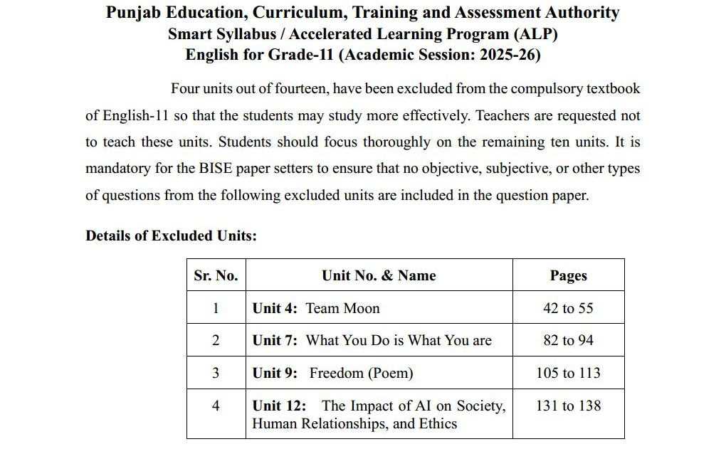 The Punjab Curriculum & Textbook Board (PCTB) in association with Punjab Education Curriculum Training and Assessment Authority (PECTAA) has revised the syllabus under the Smart ALP scheme to help students cover essential topics without stress. Under this plan, some chapters and questions are excluded, allowing students to focus on core areas.