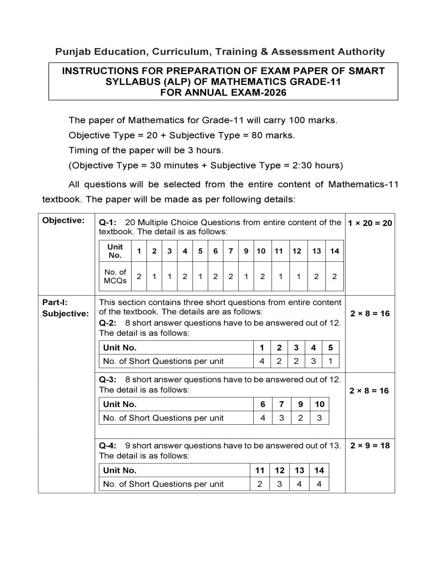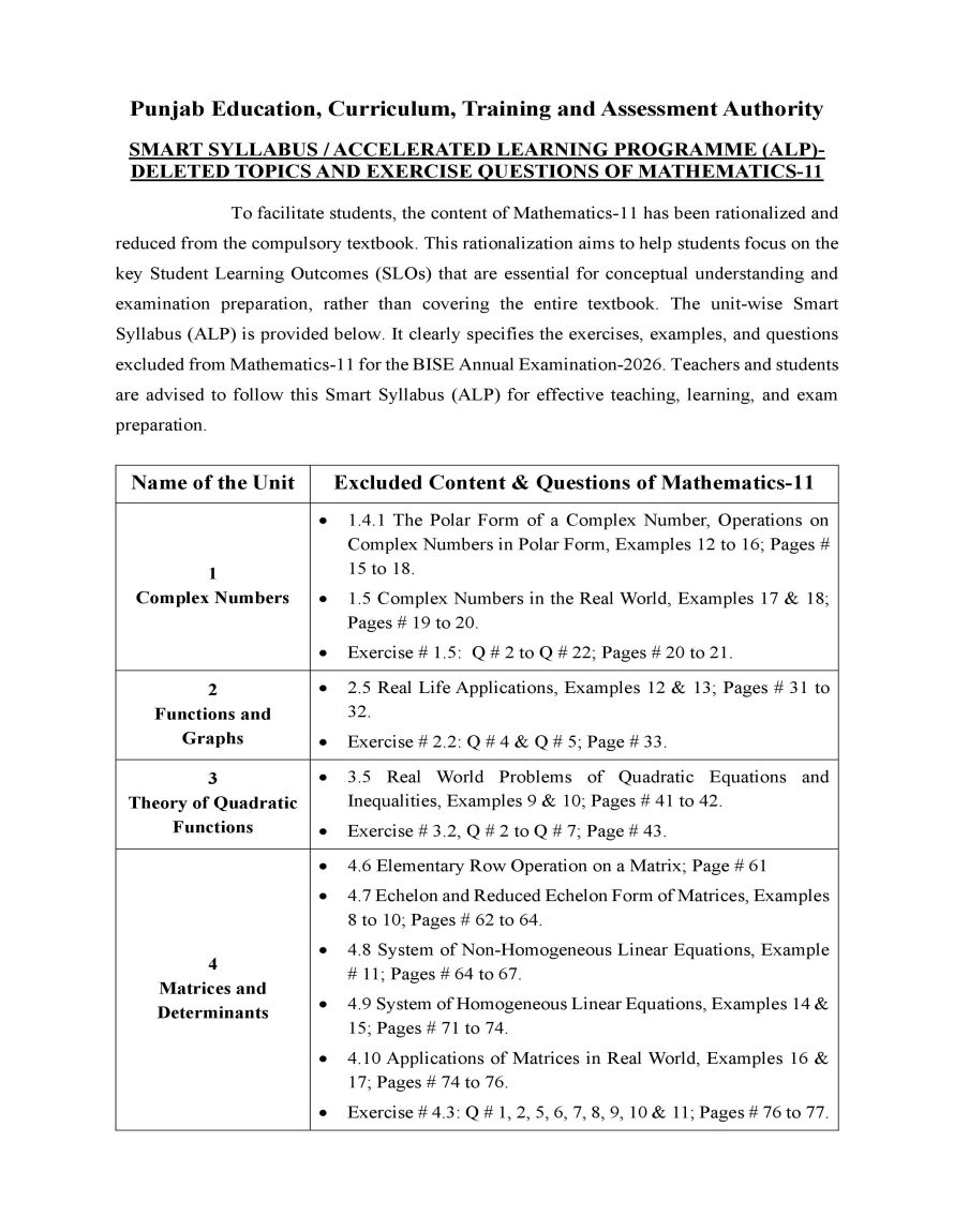 The Accelerated Learning Program (ALP) or Smart Syllabus aims to reduce syllabus pressure and help students concentrate on the most important chapters. It’s officially approved for all Punjab Boards, including Lahore, Multan, Faisalabad, Gujranwala, Sahiwal, Rawalpindi, Bahawalpur, DG Khan, and Sargodha. Class 11 Math Revised Pairing Scheme 2025–27 for Punjab Boards is as under;