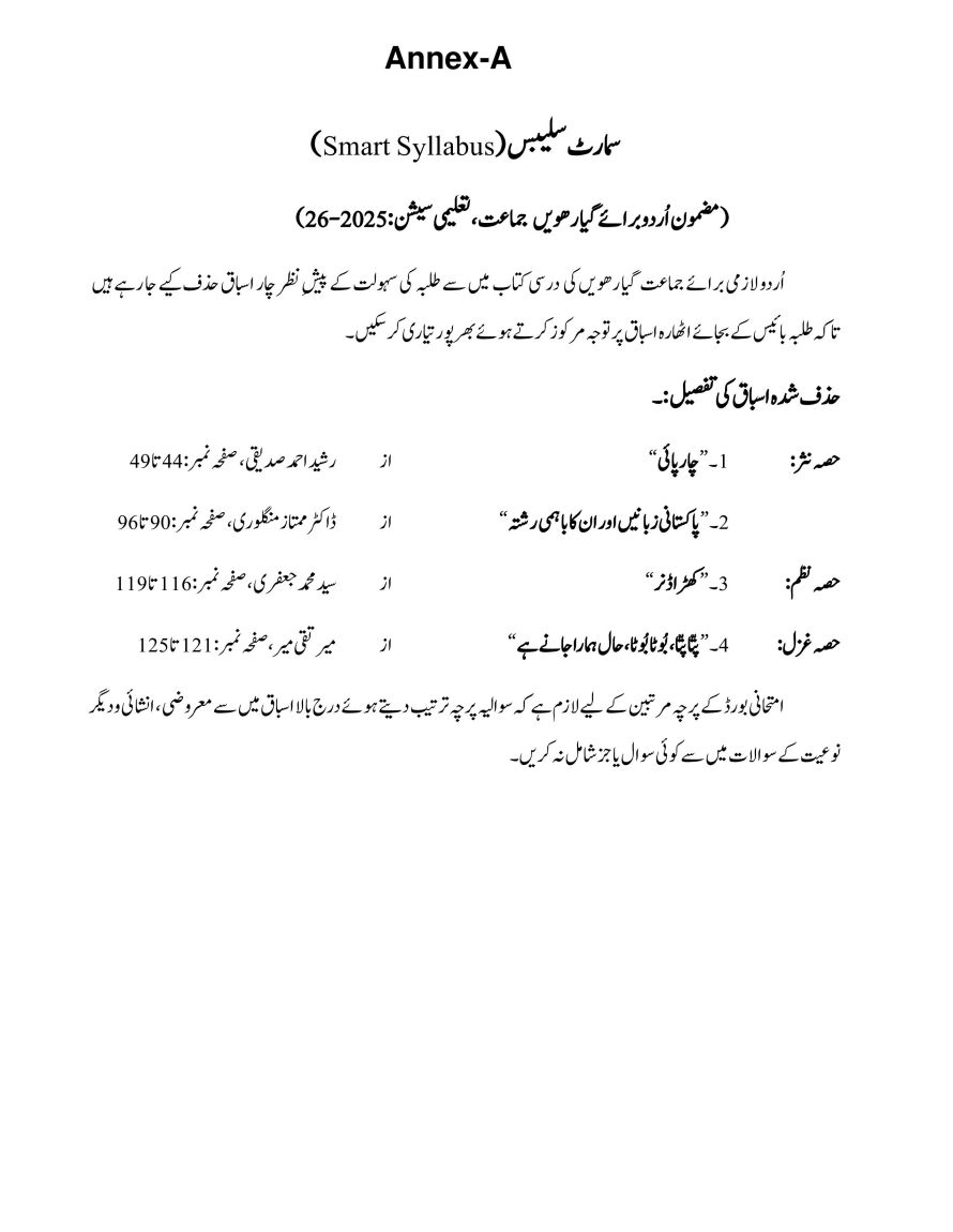 The Accelerated Learning Program (ALP) or Smart Syllabus aims to reduce syllabus pressure and help students concentrate on the most important chapters. It’s officially approved for all Punjab Boards, including Lahore, Multan, Faisalabad, Gujranwala, Sahiwal, Rawalpindi, Bahawalpur, DG Khan, and Sargodha. Class 11 Urdu Revised Pairing Scheme 2025–27 for Punjab Boards is as under;